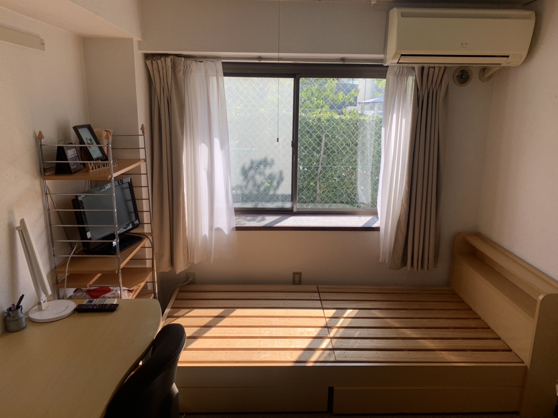 ベッド、机、イス、クローゼット、書棚、エアコン、照明器具、カーテンなどが備え付けられています。