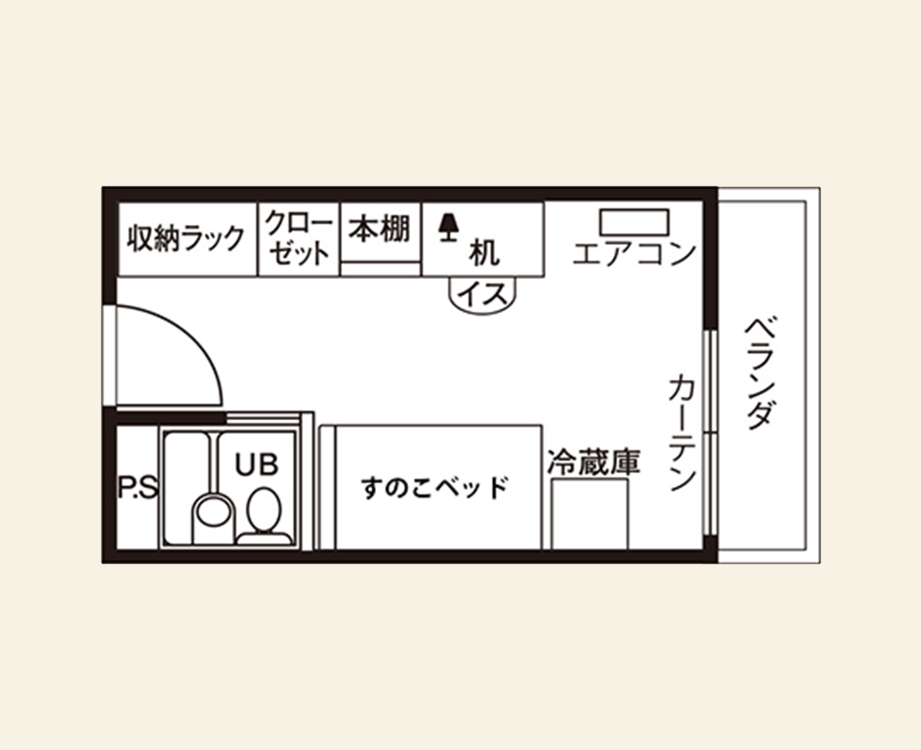 エアコン 居室Wi-Fi すのこベッド デスク 椅子 照明 カーテン タンス(クローゼット) 書棚(ラック) 2ドア冷蔵庫 ユニットバス(バス トイレ一体) TV端子 IHヒーター