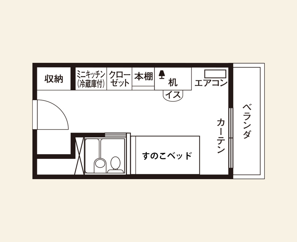 エアコン 居室Wi-Fi すのこベッド デスク 椅子 照明 電気スタンド カーテン クローゼット 書棚(ラック) シューズロッカー TV端子 ユニットバス(バス トイレ一体) ミニ冷蔵庫 ミニキッチン(電気コンロ) ベランダ
